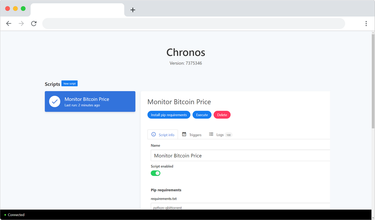 To install, open your command line and pop in the following: docker run simsemand/chronos -p 5000:5000 -v /chronos:[chronos_path] Just make sure to update the path to a folder on your computer or server.